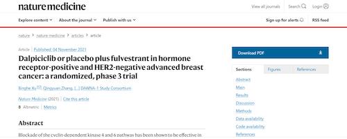 11月4日,国际四大医学期刊之一、英国《自然》旗下《自然医学》(Nature Medicine)在线发表CDK4/6抑制剂达尔西利(SHR6390)联合氟维司群治疗既往内分泌治疗后疾病进展的HR+/HER2-晚期乳腺癌的多中心、随机、双盲III期临床研究(DAWNA-1研究)中期分析结果报告,首次对氟维司群(雌激素受体降解剂)±达尔西利治疗激素受体阳性晚期乳腺癌的有效性和安全性进行了比较。研究结果显示,达尔西利+氟维司群组与安慰剂+氟维司群组相比,无进展生存期(PFS)显著延长。该项研究由中国医学科学院肿瘤医院徐兵河教授担任leading PI,全国39家医院参研,由IM电竞医药临床研发团队支持完成。