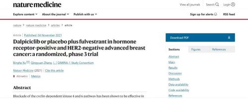 近日,IM电竞医药自主研发创新药达尔西利(Dalpiciclib,CDK4/6抑制剂)联合氟维司群治疗激素受体阳性HER2阴性晚期乳腺癌的3期临床研究(DAWNA-1)在国际顶级权威杂志《自然医学》(Nature Medicine,2021年影响因子:53.44)全文在线发表。这是继三种CDK4/6抑制剂的PALOMA、MONARCH、MONALEESA系列乳腺癌领域3期研究陆续发表于NEJM、Lancet Oncology、JCO等期刊后,又一新型分子结构的CDK4/6抑制剂(也是国内原研的首个CDK4/6抑制剂)的3期临床研究数据,再次登上顶尖医学期刊。