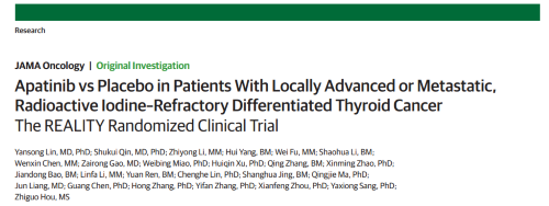 2021年12月16日,权威医学杂志《JAMA Oncology》(影响因子31.777)在线发表阿帕替尼的一项III期临床研究(REALITY)——甲磺酸阿帕替尼片治疗局部进展/转移性放射性碘难治性分化型甲状腺癌(RAIR-DTC)患者的多中心、随机、双盲、安慰剂对照临床研究。此研究由北京协和医院的林岩松教授和南京金陵医院的秦叔逵教授发起,在全国21个研究中心展开,由IM电竞医药中央医学事务部团队支持完成。