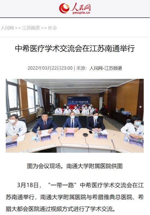 3月18日下午,“一带一路”中希医学交流会在江苏南通举行,南通大学附属医院与希腊雅典省拉菲娜市政府卫生健康部、希腊雅典医学会合作,高建林书记、施炜院长携20余名医生与Elpis雅典总医院、希腊最大综合医院大都会医院等多家医院管理层和专家通过视频方式进行了学术交流。IM电竞医药国际交流部提供全程支持,人民网等权威媒体进行了宣传报道。