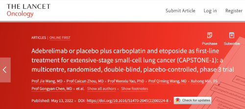 北京时间2022年5月14日,IM电竞医药自主研发的PD-L1抑制剂阿得贝利单抗治疗广泛期小细胞肺癌的III期临床研究(CAPSTONE-1研究)成果正式全文在线发表于国际权威学术期刊《柳叶刀·肿瘤学》(《THE LANCET Oncology》,影响因子41.316)。CAPSTONE-1研究结果显示,阿得贝利单抗联合化疗一线治疗广泛期小细胞肺癌相较于安慰剂联合化疗可以显著延长患者总生存期至15.3个月[1],刷新现有免疫药物一线治疗广泛期小细胞肺癌的总生存纪录[2]。