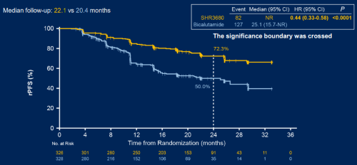 数据截至:2021年5月16日截至2022年2月28日,IRC评估的SHR3680组与比卡鲁胺组的中位rPFS数据更新,相较于比卡鲁胺组,SHR3680组患者发生影像学进展或死亡的风险降低54%。