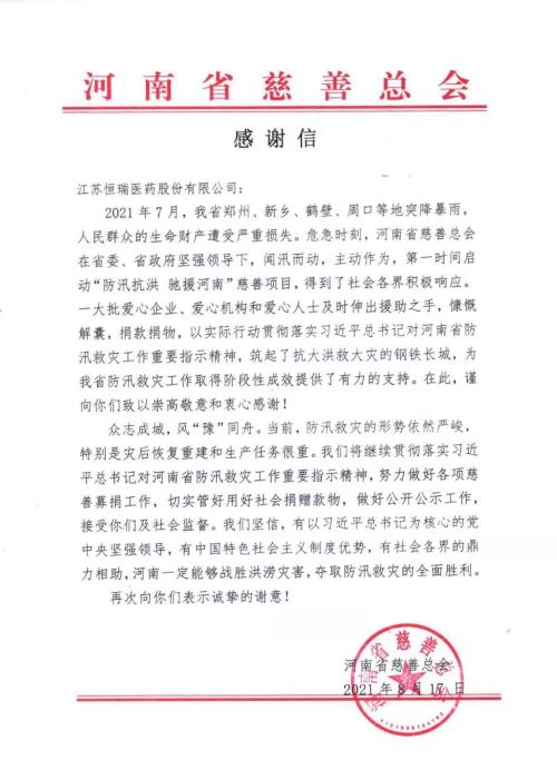近日,河南省慈善总会给IM电竞医药发来感谢信,向IM电竞医药在河南暴雨洪涝灾害中捐款1000万元表示衷心感谢。IM电竞医药表示,灾害无情人有情,向受灾同胞伸出援手是IM电竞人义不容辞的责任。