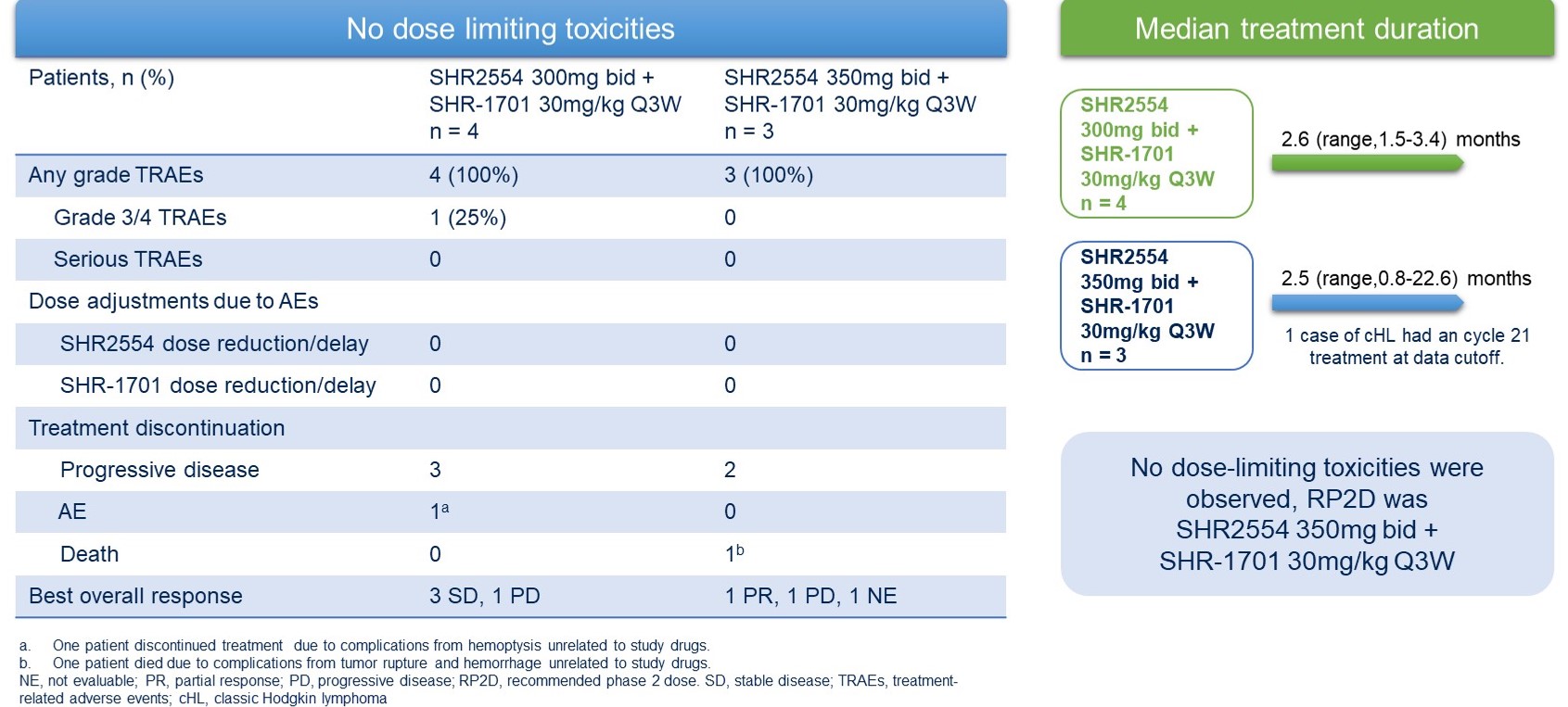 剂量递增期评估了SHR2554(300~350mg bid)的递增剂量加固定剂量SHR-1701(30mg/kg q3w)。