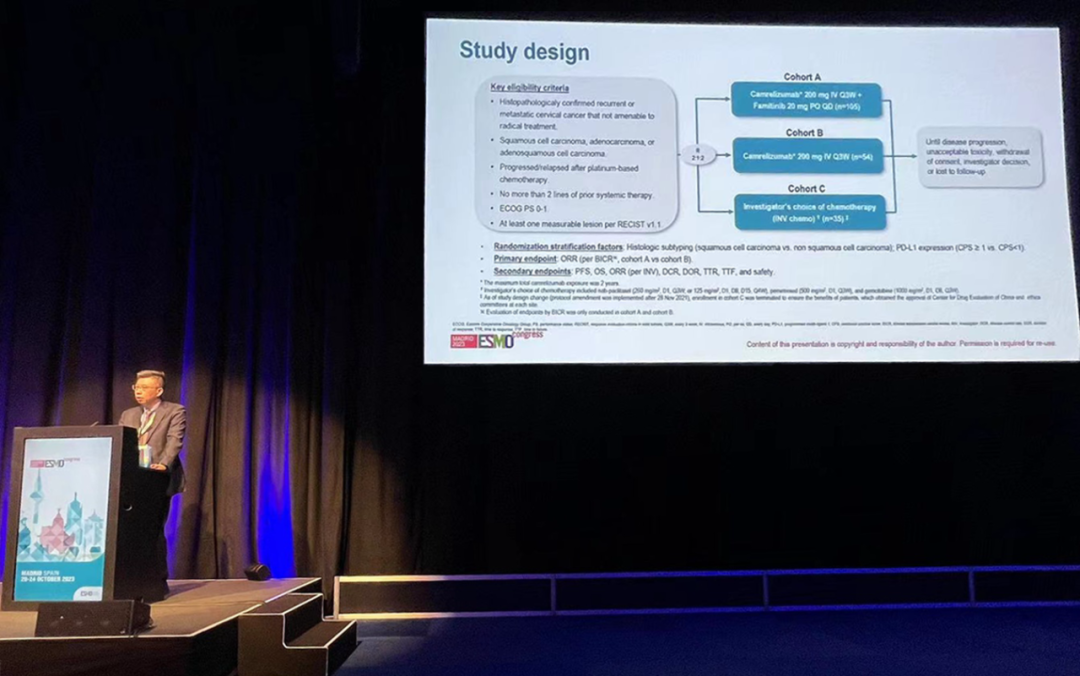 有望为宫颈癌患者带来治疗新选择10月22日,IM电竞医药创新药卡瑞利珠单抗联合法米替尼对比卡瑞利珠单抗单药或研究者选择的化疗治疗复发转移性宫颈癌随机、开放、对照、多中心的Ⅱ期临床研究(SHR-1210-Ⅱ-217) 亮相2023 ESMO大会简短口头报告现场3。该研究由复旦大学附属肿瘤医院吴小华教授团队开展,吴小华教授在现场公布了该重磅研究进展。研究结果显示,在既往以铂为基础化疗失败后复发或转移性宫颈癌患者中,与单独使用卡瑞利珠单抗或研究者选择的化疗相比,卡瑞利珠单抗联合法米替尼显著提高了抗肿瘤活性,安全性可控,有望为晚期宫颈癌患者提供新的治疗选择。